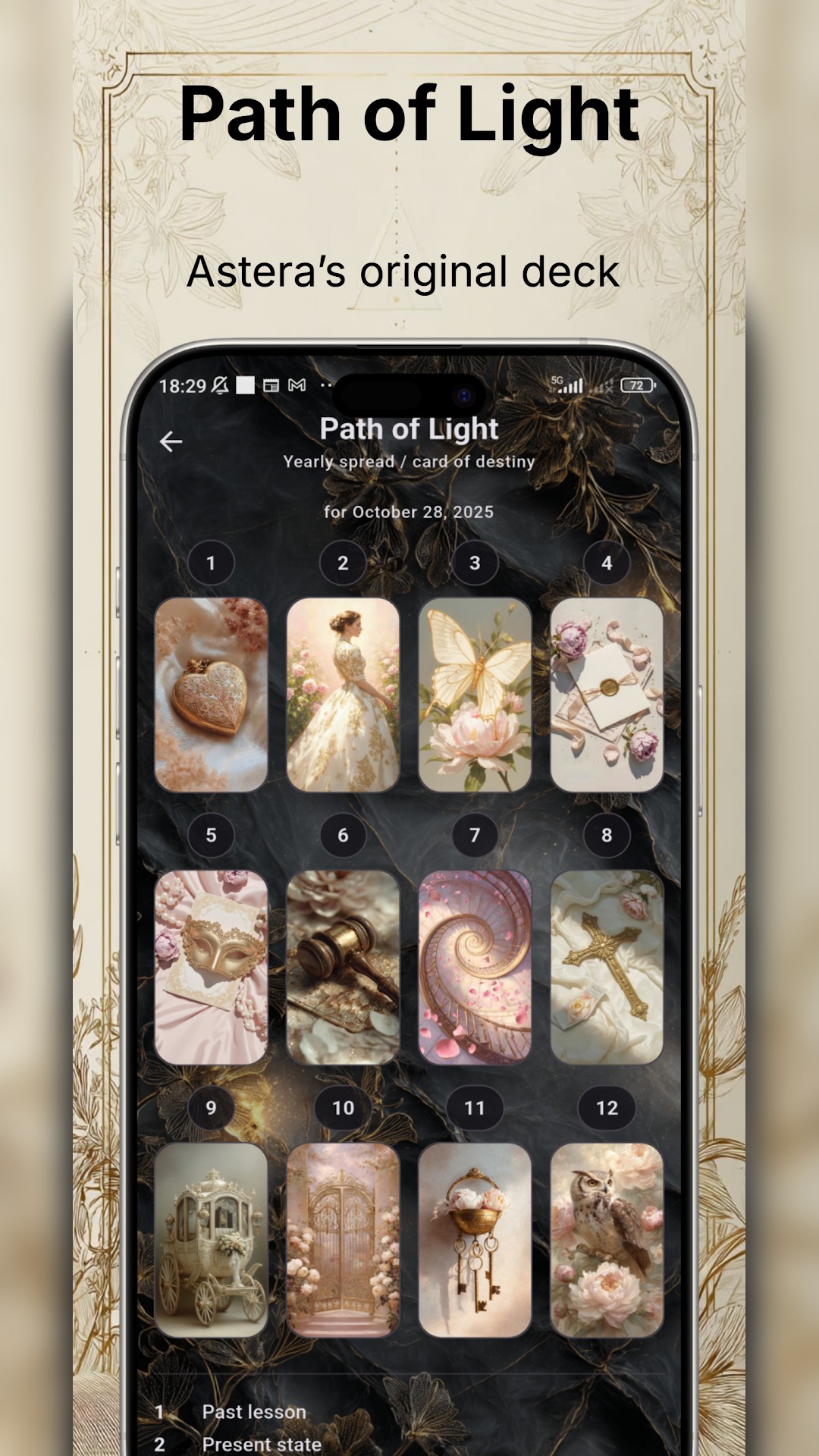 Astera Oracle & Numerology combines a warm Victorian-style oracle with practical numerology: daily card, quick spreads, name numbers, compatibility and Personal Year timing.