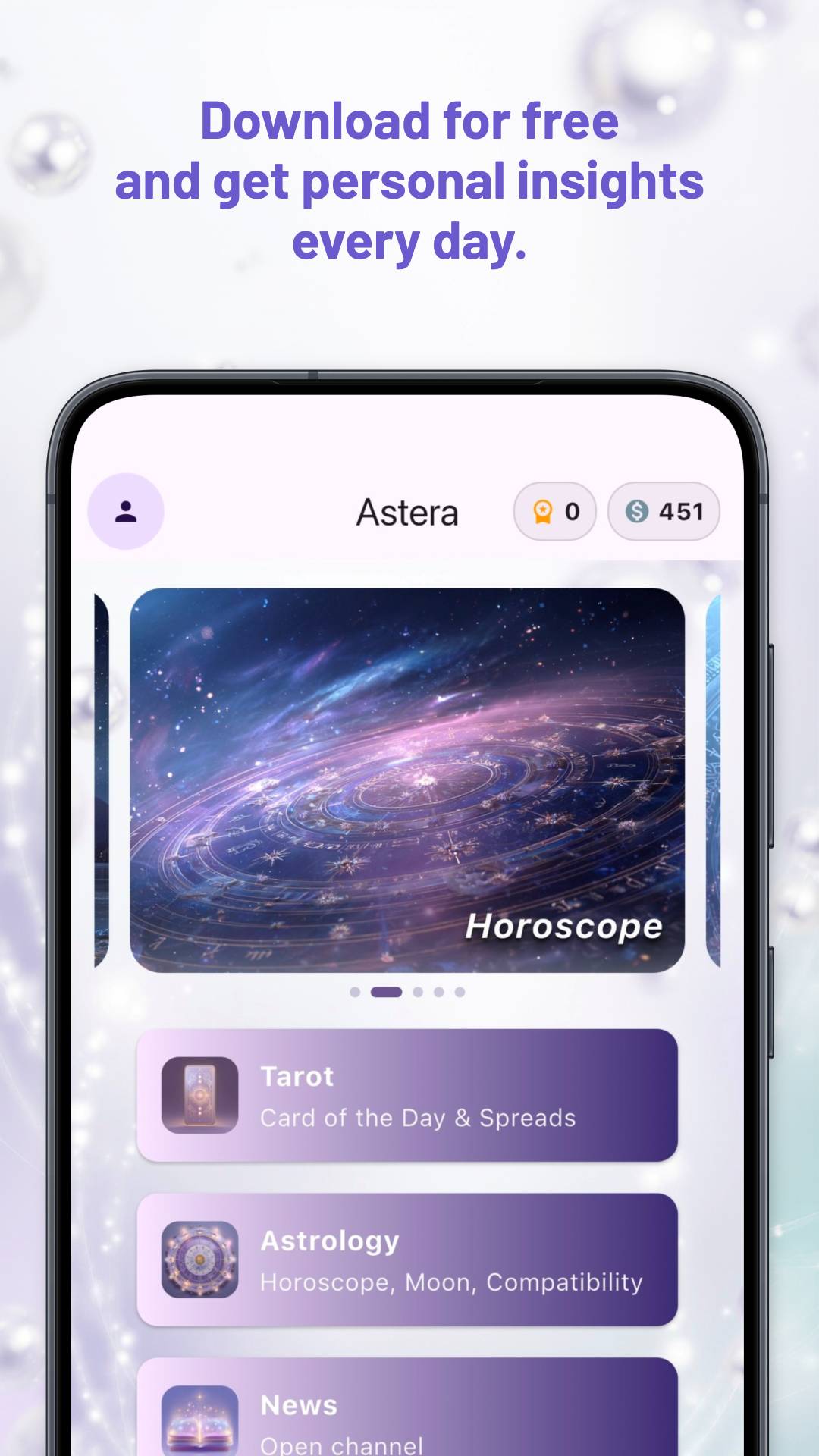 Astera Tarot & Horoscope is an Android app built for everyday use: Daily Tarot Card, quick Yes / No, tarot spreads, daily energy guidance, Couple Profile, Moon calendar, natal chart, solar return, glossary, daily recommendations, news and personal services by Olga Astera.
