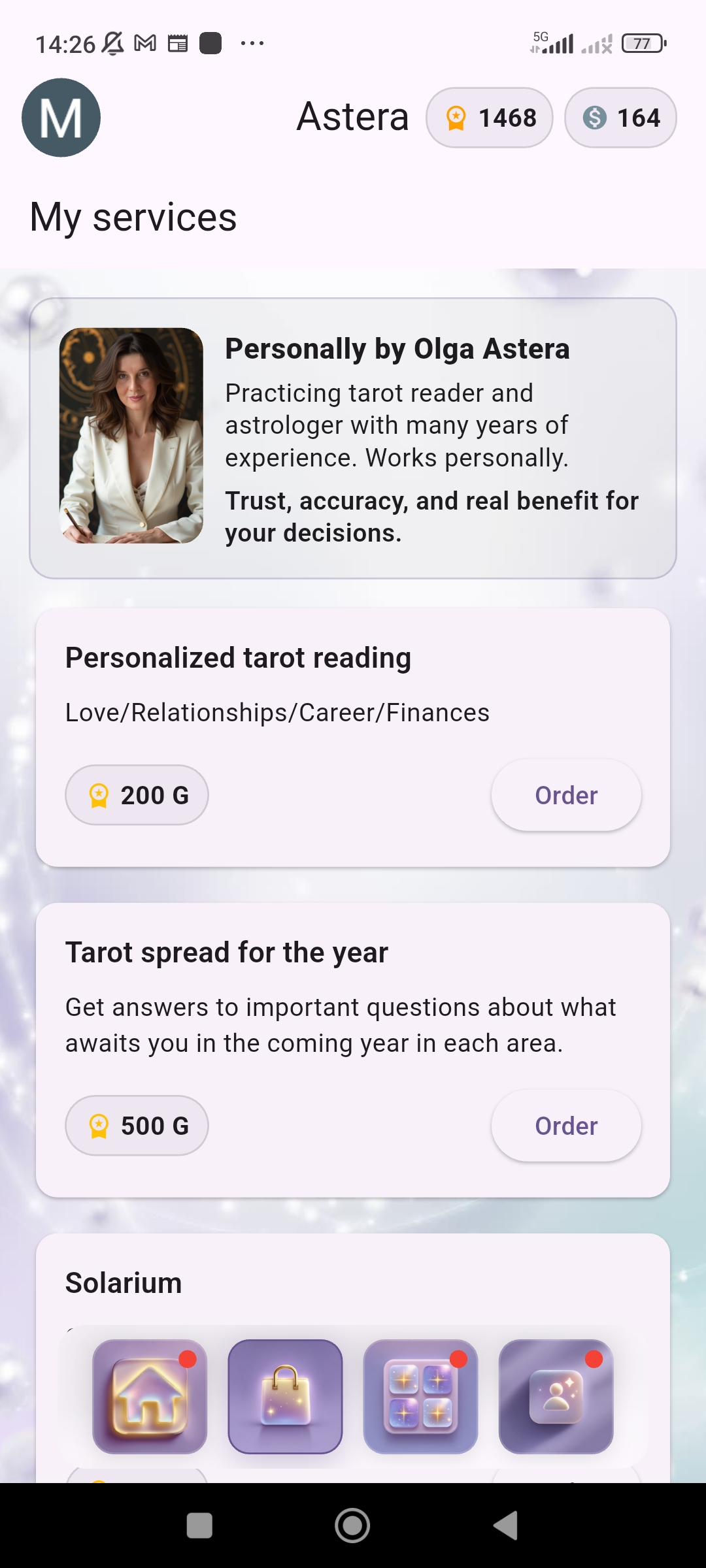Astera Tarot & Horoscope includes a real service layer inside the app. In the My services section, users can order personal tarot and astrology work performed manually by Olga Astera, track the request status and receive the result directly inside the app.